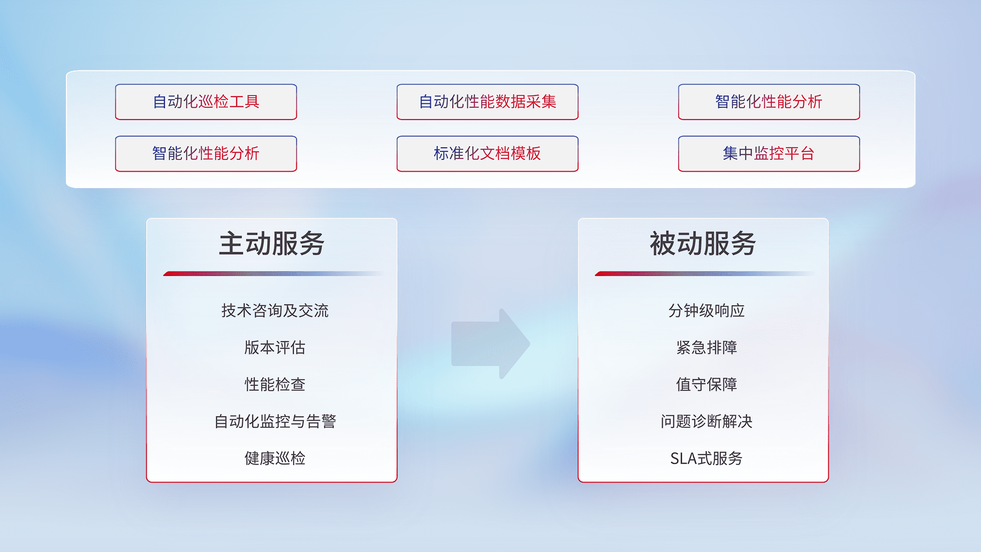 智能化工具和标准化文档,,,保障服务质量,,,,提供主动服务(包含技术咨询、、、版本评估、、、、性能检查、、、、自动化监控与告警、、、、健康巡检)和被动服务包含(分钟级响应、、紧急排障、、、、值守保障、、、问题诊断解决、、SLA服务)。。。